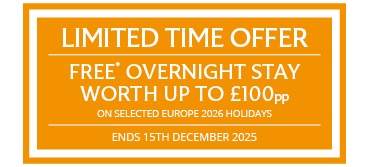 Free overnight stay in London worth up to £100pp before selected Europe 2026 holidays, when you book by 15th December. Call only offer quoting OVERNIGHT. Please note this offer is only applicable to bookings made on or after Tuesday 11th November and before midnight of Monday 15th December 2025.