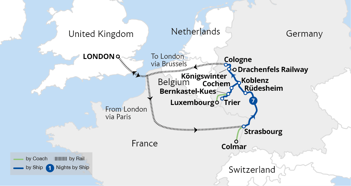 Flowing effortlessly from France's Vosges Mountains, the Moselle River winds through Luxembourg before meeting the Rhine in Koblenz. Along this scenic route through one of the world's premier wine-producing regions, discover picturesque landscapes covered in tiered vineyards, medieval castles and charming villages that have inspired travellers for centuries.